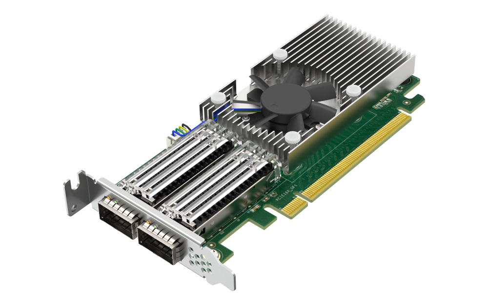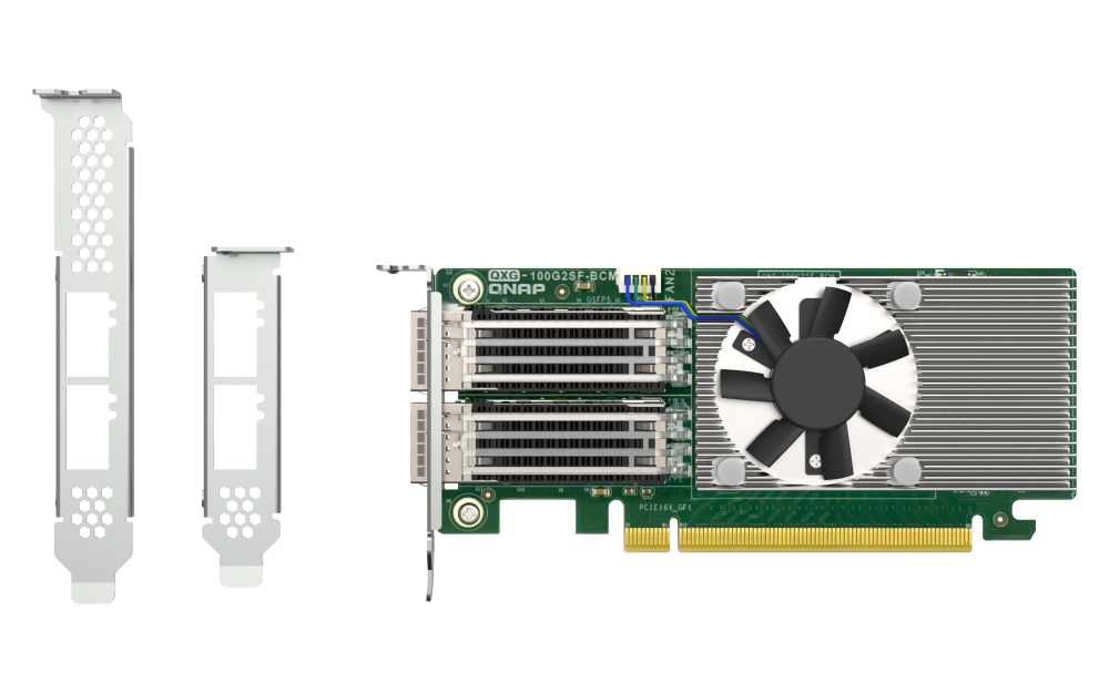 A QNAP BEMUTATJA A QXG-100G2SF-BCM-ET, EGY KÉTPORTOS, 100 GBE-S HÁLÓZATI BŐVÍTŐKÁRTYÁT