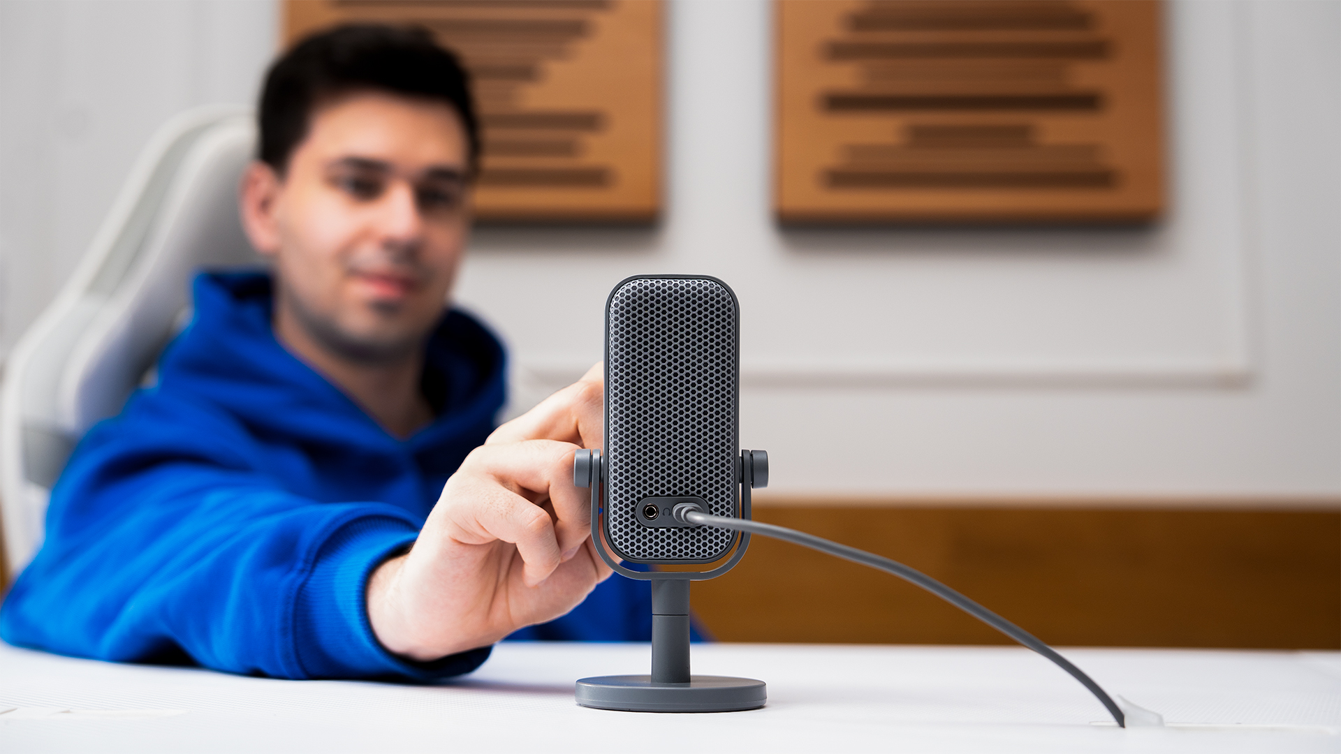 A tekerőgombbal egyszerűen szabályozhatod a mikrofon érzékenységét. A Solum Voice S Alt Gray két habszűrűvel rendelkezik – egy beépítettel és egy külsővel. Utóbbit közvetlenül a mikrofonra helyezheted a zárhangok és a zavaró háttérzajok szűréséhez.