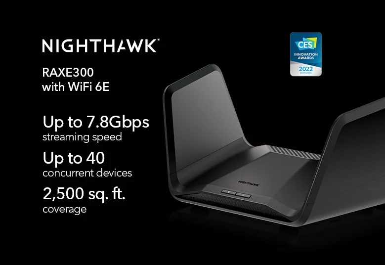 A CES 2022 innovációs díjjal kitüntetett Nighthawk RAXE300 tri-band WiFi router 7,8 Gbps kombinált WiFi-sebességet, valamint az új 6 GHz-es frekvencia használatát biztosítja a felhasználók WiFi 6E készülékei számára, ezzel megfelelve a sávszélesség-igényes alkalmazások követelményeinek. A Nighthawk sorozatú routerek legújabb tagja a nyolc WiFi adatfolyammal gigabites WiFi sebességet biztosít akár 240 négyzetméternyi területen is.